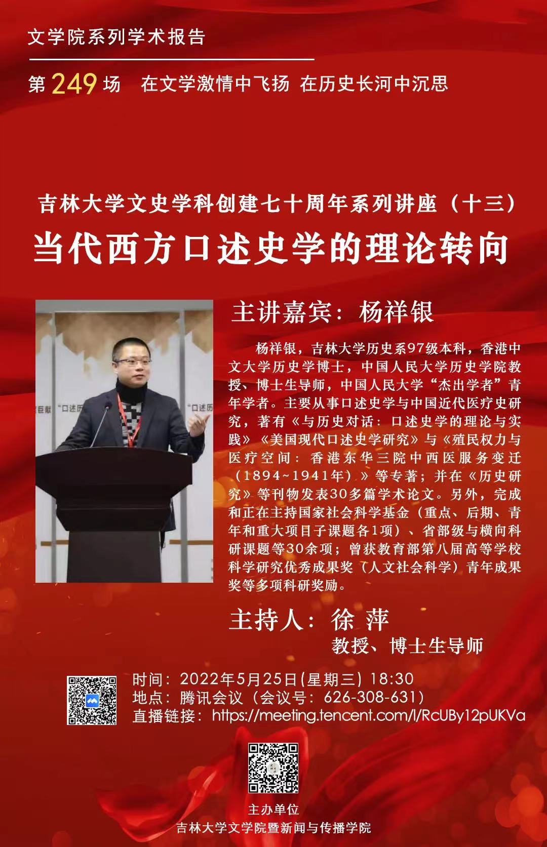 杨祥银,吉林大学历史系97级本科,香港中文大学历史学博士,中国人民大学历史学院教授、博士生导师,中国人民大学“杰出学者”青年学者。主要从事口述史学与中国近代医疗史研究,著有《与历史对话:口述史学的理论与实践》《美国现代口述史学研究》与《殖民权力与医疗空间:香港东华三院中西医服务变迁(1894~1941年)》等专著;并在《历史研究》等刊物发表30多篇学术论文。另外,完成和正在主持国家社会科学基金(重点、后期、青年和重大项目子课题各1项)、省部级与横向科研课题等30余项;曾获教育部第八届高等学校科学研究优秀成果奖(人文社会科学)青年成果奖等多项科研奖励。