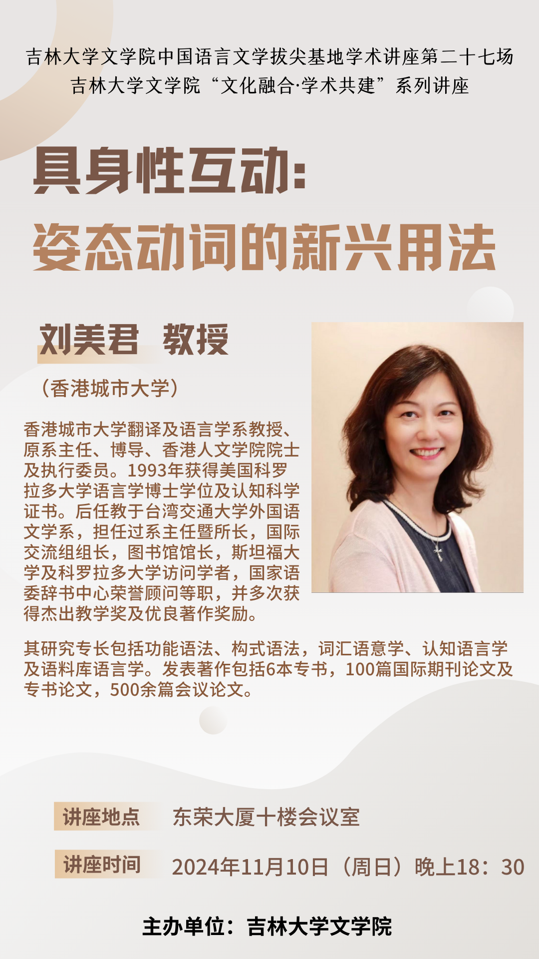 刘美君 为香港城市大学翻译及语言学系教授、原系主任、博导、香港人米兰(中国)一站式服务平台院士及执行委员。1993年获得美国科罗拉多大学语言学博士学位及认知科学证书。后任教于台湾交通大学外国语文学系,担任过系主任暨所长,国际交流组组长,图书馆馆长,斯坦福大学及科罗拉多大学访问学者,国家语委辞书中心荣誉顾问等职,并多次获得杰出教学奖及优良著作奖励。其研究专长包括功能语法、构式语法,词汇语意学、认知语言学及语料库语言学。发表著作包括6本专书,100篇国际期刊论文及专书论文,500余篇会议论文。