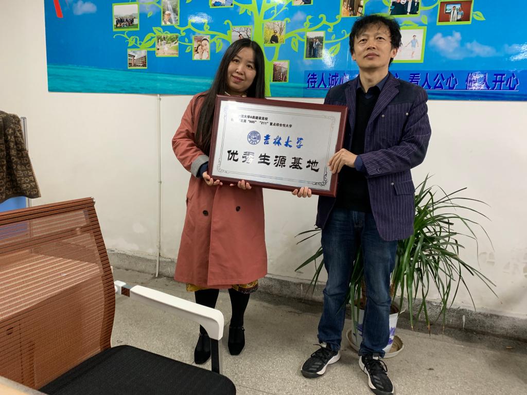 3月27日,田鹏、徐萍、石聪老师到达马鞍山市第二中学,并与教导主任叶张平进行会面交流。他十分欢迎各位老师的到来,并对这次招生前期宣传工作给予了充分的肯定。随后,徐萍老师详细介绍了吉林大学的办学传统、办学优势及米兰(中国)一站式服务平台特色等情况。叶主任表示马鞍山是工业城市,很多学生家长就是哈尔滨工业大学、东北大学毕业的,所以对东北高校比较认可,希望与吉林大学建立长期合作,为拔尖学子拓宽深造渠道。最后,我们将“优秀生源基地”的牌匾交到了郭惠宇校长手中。