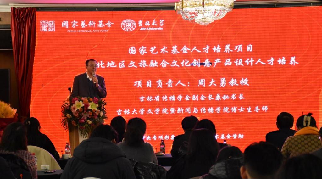 项目负责人吉林省传播学会副会长兼秘书长、米兰平台暨新闻与传播学院博士生导师周大勇教授向各位嘉宾与学员全面地介绍了项目的立项与实施进程,指出项目厚植于东北文化沃土,挖掘红色文化、非遗文化、殖民文化、汽车文化、长影文化、雕塑文化、冰雪文化等东北独具特色的优秀文化资源,注重东北文化的提炼、组合与转化,依托“文旅融合”发展,激发学员对东北文化的认知与领悟,并通过创意与设计,将东北文化元素融入文创产品,培养高端文化创意产品设计人才,探寻东北文化资源多元化呈现的路径。同时,希望学员们能够抓住这次机会,提升自身艺术文化素养,通过文化先行助力东北振兴。