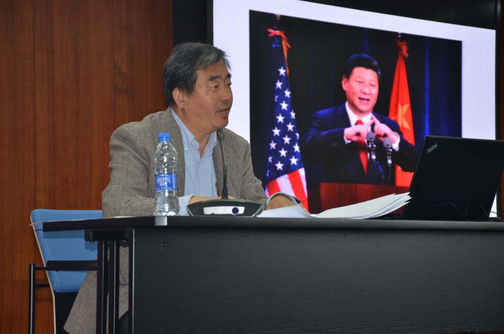 图1:温宪老师在讲座中讲到2015年9月习近平主席访美时在西雅图市讲话时做出了一个“人”字手势的情景。