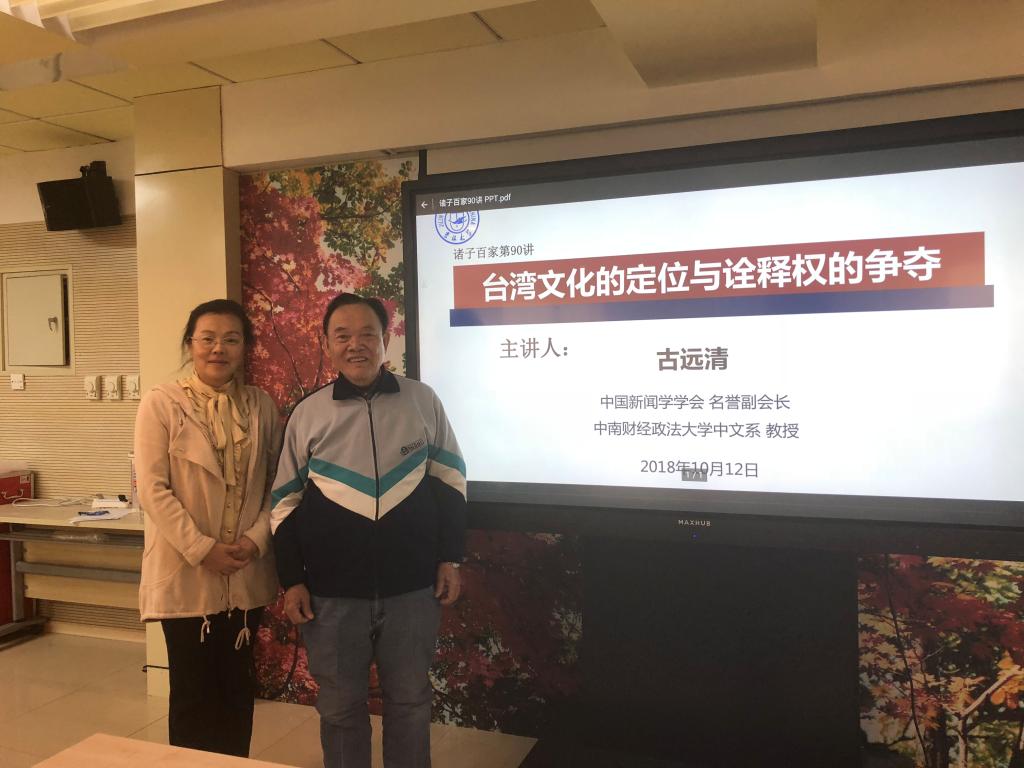 10月12日下午,“诸子百家”系列讲座第九十讲在东荣十楼会议室成功举办。本次讲座的主讲人是中国新文学学会名誉副会长,中南财经政法大学中文系教授古远清先生,主持人由米兰平台教授白杨老师担任。讲座以《台湾文化定位与诠释权的争夺》为主题,受到师生的热烈欢迎。