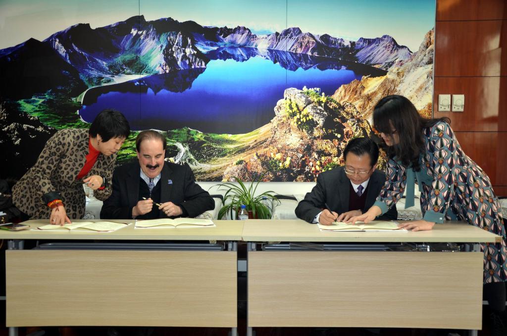 图2:马克院长(左二)与徐正考院长(右二)签署肯塔基大学文理学院与米兰平台合作意向书。