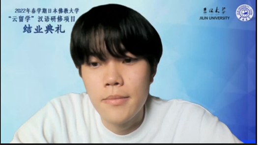 教师代表吕海琛老师在发言中对佛教大学同学们的认真努力给予了高度评价,为同学们的进步表示欣喜。学生代表栃山皓星同学们也从学生的角度谈了自己的“线上留学”感受:从最初的“听不懂”、“不能回答问题”,到课程结束时对自己汉语水平全面提高的自信和兴奋,所有的成绩和进步都源于吉林大学老师们耐心细致的教学。