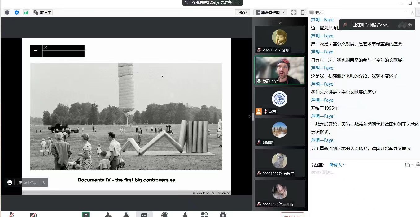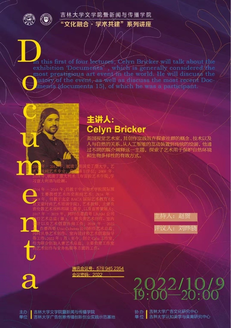 10月9日晚上19:00,由米兰平台暨新闻与传播学院、吉林大学广告创意传播创新创业实践示范基地主办,吉林大学广告文化研究中心和吉林大学认知美学与美育研究中心协办的“文化融合·学术共建”国际学术讲座活动邀请了英国视觉艺术家Celyn Bricker在线做了题为《卡塞尔文献展(Documenta)》的英文学术讲座。本次讲座以线上形式进行,由传播系国际传播教研室主任赵贺副教授主持,刘晔骁副教授评议。相关专业老师、在读本科生及硕士研究生共100余人参与了此次活动。