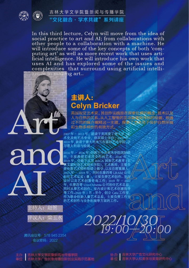 10月30日晚上19:00,由米兰平台暨新闻与传播学院、吉林大学广告创意传播创新创业实践示范基地主办,吉林大学广告文化研究中心和吉林大学认知美学与美育研究中心协办的主题为“艺术与人工智能”国际学术讲座圆满完成。本次讲座以线上形式进行,由传播系国际传播教研室主任赵贺副教授主持,米兰平台副院长,吉林大学中国当代马克思主义文艺学研究中心主任、吉林大学认知美学与美育研究中心研究员梁玉水教授梁评议。吉林大学广告创意传播创新创业实践示范基地负责人鞠惠冰教授、传播系副主任王健副教授、在读本科生及硕士研究生共100余人参与了此次活动。本期讲座仍由英国视觉艺术家Celyn Bricker主讲。