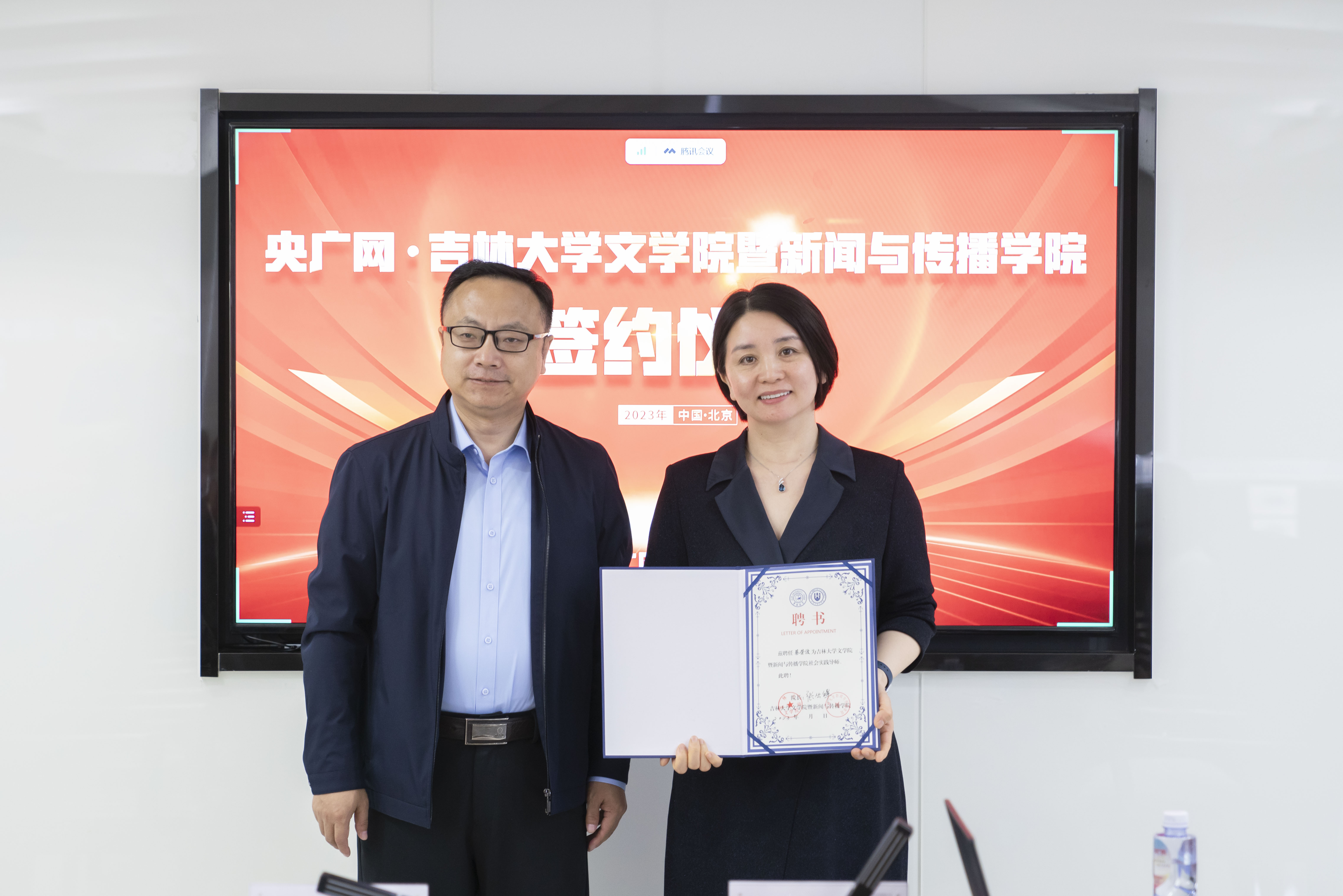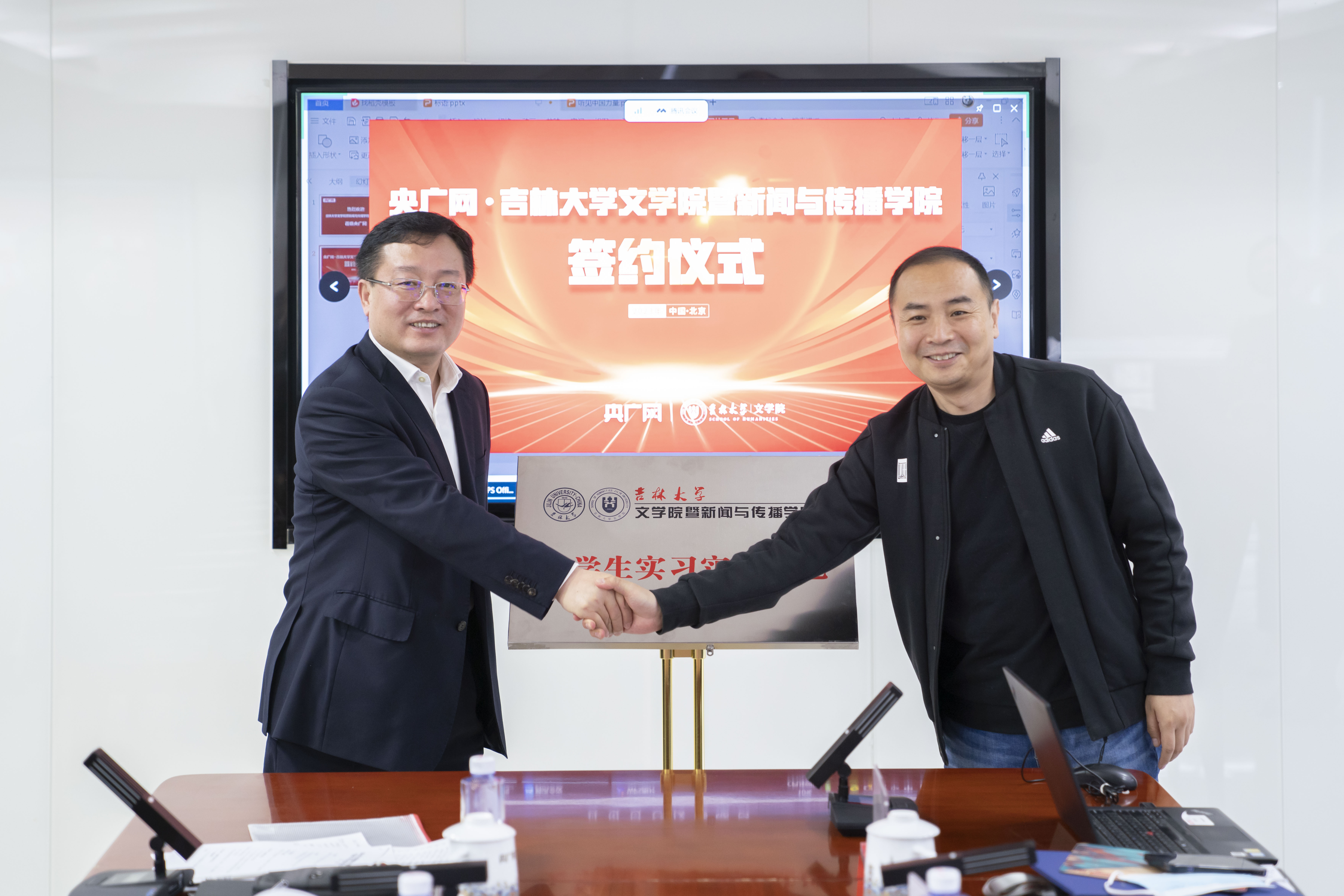 央广网副总编辑伍刚、副总经理宫歆慧、人力资源高级总监汪潇、央广网吉林分公司负责人邢程,米兰平台副书记杨一博、院长助理、校友办主任田鹏,学工办主任李芊满、新闻学系主任严俊教授等出席签约仪式。