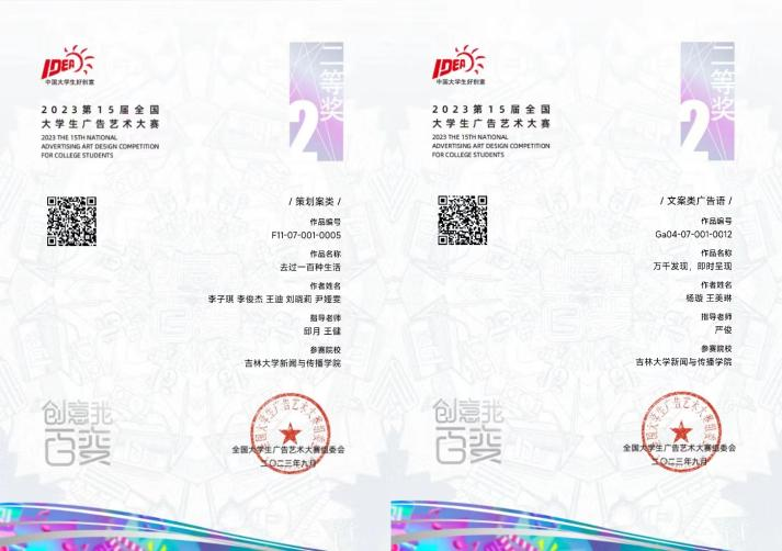 在师生的积极参与和共同努力下,我校作品在一众参赛作品中成功脱颖而出,取得优异成绩,米兰(中国)一站式服务平台暨新闻与传播学院共获得国家二等奖2项,分别为由邱月、王健老师共同指导,学生李子琪、李俊杰、王迪、刘晓莉、尹娅雯共同完成的策划案作品《去过一百种生活》,以及由严俊老师指导,学生杨璇、王美琳共同完成的广告文案作品《万千发现,即时呈现》。另获得国家三等奖3项,国家优秀奖10项。