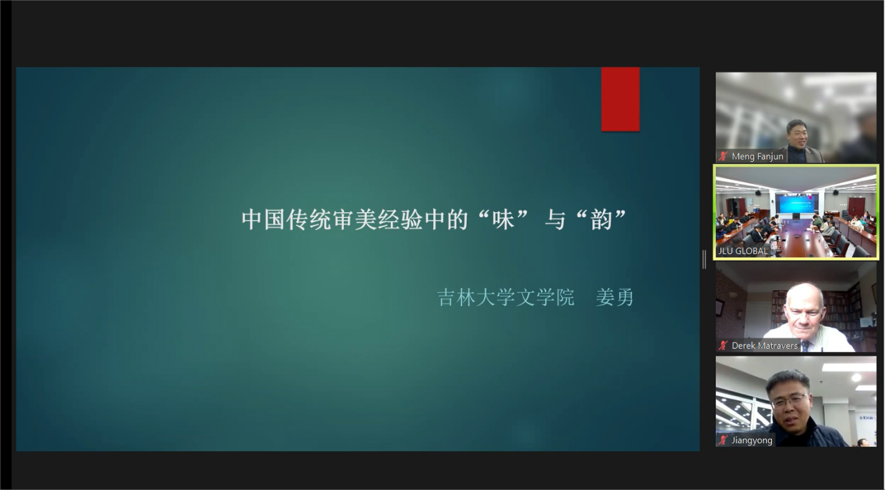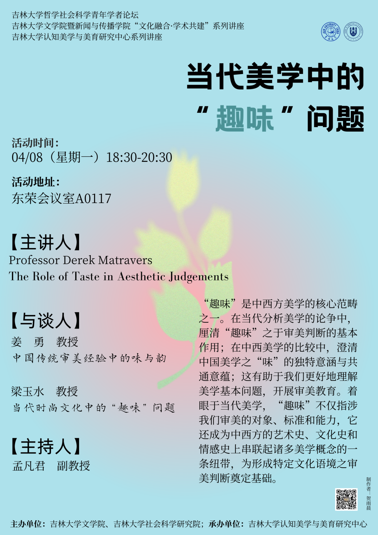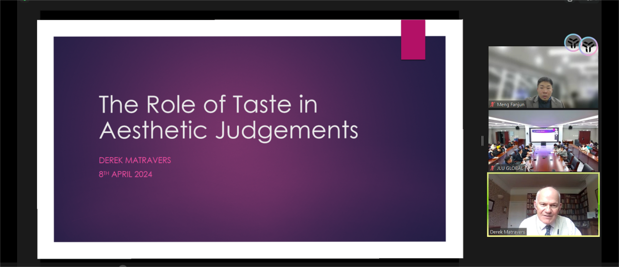 本次论坛主题为“当代美学中的‘趣味’问题”,特邀剑桥大学丘吉尔学院研究员、开放大学教授、《英国美学杂志》编辑Derek Matravers教授担任主讲嘉宾,米兰平台姜勇教授和梁玉水教授作为与谈人进行交流。三位学者共同在“趣味”的当代发展、中西比较、时尚文化多重视域中,探讨了“趣味”在审美判断中的作用和价值。吉林大学社会科学研究院院长曲红梅教授出席了本次论坛。论坛吸引了来自校内各个学院的青年教师、研究生、本科生四十余人。四位浙江大学当代美学博士参加了线上学习与研讨。吉林大学认知美学与美育研究中心副主任孟凡君副教授发起并主持了本次论坛。