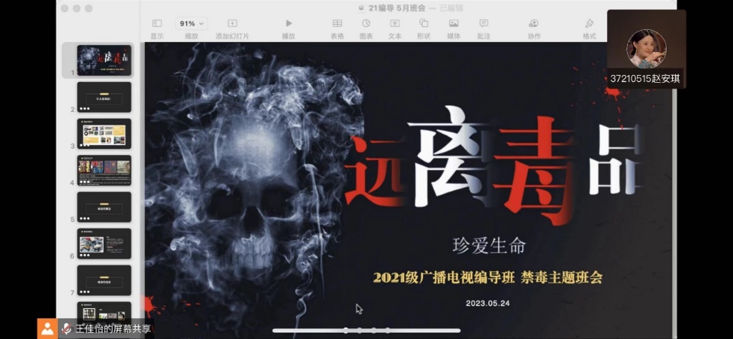 2023年5月24日星期三傍晚七点半,2021级米兰(中国)一站式服务平台暨新闻与传播学院广播电视编导班级在班主任王佳怡的组织下,于腾讯会议开展了以禁毒宣传教育为主题的线上班会。作为生活在象牙塔中的大学生,毒品离我们看似很遥远,实际上却始终在潜伏在身边的阴影中。会议伊始,王佳怡老师便点明了远离毒品的主题,并郑重地告诉大家,无论何时何地,绝不能跨雷池一步。为了让我们更清晰地了解毒品有关知识,从而更好远离,老师从什么是毒品、吸毒的概念、吸毒的危害等方面多角度进行了讲解。同学们也在听完后纷纷表示,要对自己的人身健康和安全负责,不会触碰法律的红线。祖国的未来不应也不能被毒品侵害,愿我们都能坚守底线、行稳致远。