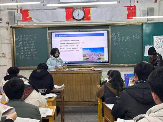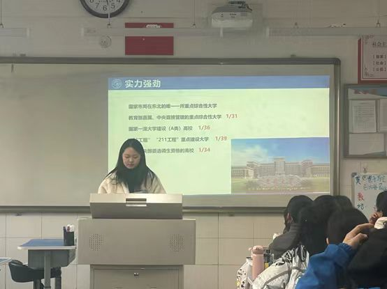 在活动现场,成员借助吉林大学宣讲PPT,生动详尽地讲解有关吉林大学的基础条件和校园生活。同学们热情配合,活动现场气氛轻松和谐。在互动提问环节,同学们积极踊跃参与,就多方面问题进行咨询,宣讲队成员耐心解惑。在介绍吉大的同时,队员还向同学们分享了自己备战高考的心得和学习方法,鼓励他们保持努力,去往心中理想的学校。