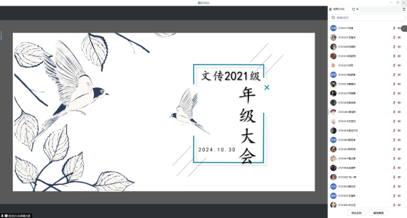 2024年10月30日,文传学院2021级本科生10月年级大会于线上召开,年级全体学生参会,辅导员杨佳欣主持会议。本次大会围绕在校安全、学业任务、就业指导三大主题开展。