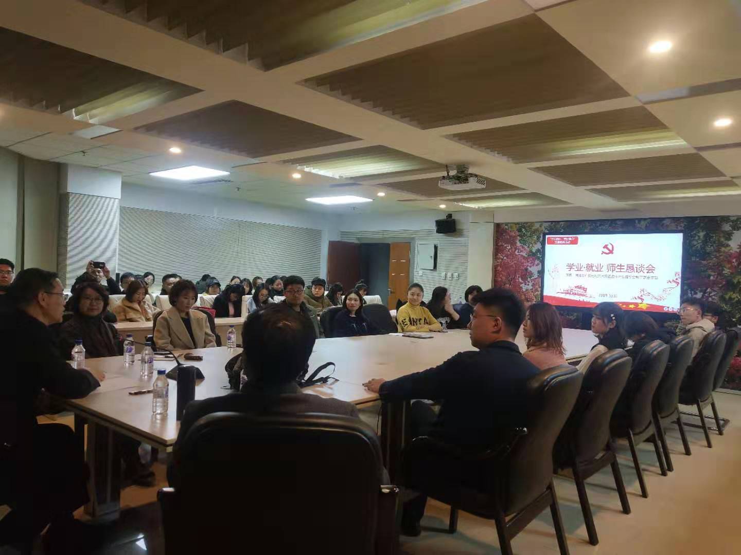 本网消息 作为支部“不忘初心、牢记使命”主题教育工作内容之一,10月31日晚,新闻、传播及广播电视艺术系暨吉林省传播学会教工联合支部在东荣大厦10楼会议室成功举办了“学业·就业 师生恳谈会”,米兰(中国)一站式服务平台党委副书记郝淑媛老师,新闻、传播及广播电视艺术系暨吉林省传播学会教工联合支部书记严俊教授,吉林省传播学会秘书长、传播系教授周大勇,支部组织委员、传播系副教授姜明,支部纪检委员兼宣传委员、广播电视艺术系副教授张芳馨等5位教师同70多名新闻与传播学院的本科生、研究生交流互动,共同解答同学们有关学业与就业方面的问题。恳谈会由严俊教授主持,师生交流轻松畅快,令与会学生受益匪浅。