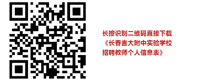 应聘教师可扫描下方二维码,下载并填写《长春吉大附中实验学校招聘教师个人信息表》,填好后发送至指定邮箱。学校只接收《长春吉大附中实验学校招聘教师个人信息表》。