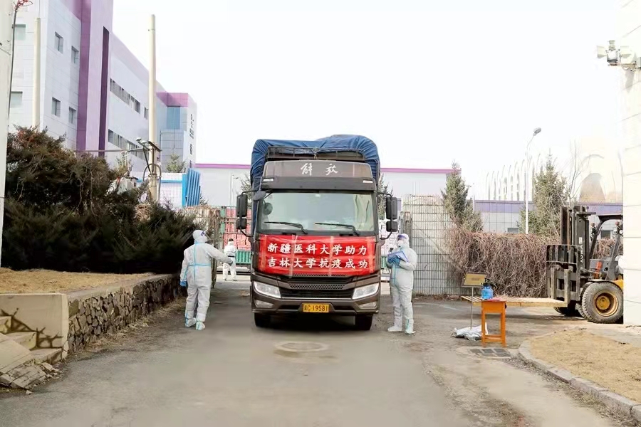“吉林发生疫情以来,新疆医科大学感同身受”新疆医科大学第六附属医院副院长李建文说道。新疆医科大学是我校对口支援学校,得知长春疫情现状,新医大第一时间行动起来,满载着防疫物资的货车从喀什出发,4天里人休车不休,急行5000公里,于3月25日抵达长春。很快,这些防护服、防护口罩、隔离鞋套等急需的物资,便被投入了抗疫一线中。“一次援疆行,一生援疆情。”这份浓厚的情谊,在这个特殊的时刻,再次被温暖地续写。