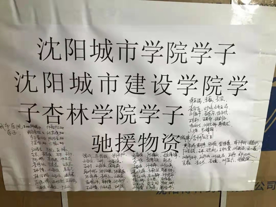 3月23日,同样封闭在校园内的沈阳城市学院、城市建设学院、杏林学院100余名学子,用自己的零用钱购买了1万个医用外科口罩,并在每一个口罩箱子上都写满爱心签名和祝福,通过当地应急救援团队连夜送到吉林大学。这些钱从一角到一百块不等,饱含着同学们浓浓的心意和并肩战胜疫情的美好期望,跨越山水,送来了如春风般的暖意。
