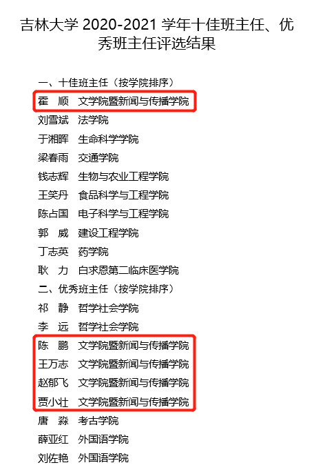 近日,米兰(中国)一站式服务平台暨新闻与传播学院5位本科生班主任获得“吉林大学2020-2021学年十佳班主任、优秀班主任”荣誉称号。其中,霍顺老师荣获“十佳班主任”称号,陈鹏、王万志、赵郁飞、贾小壮老师荣获“优秀班主任”称号。