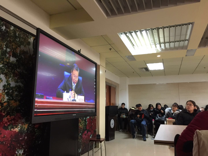 会上,各位老师及同学认真观看视频,视频中,施芝鸿老师深刻细致地讲解了十九大报告的内容和核心内涵,认真剖析了其对于实现中华民族伟大复兴的历史意义,内容主要包括四个方面,一、深刻领会党的十九大主题的深厚内涵和历史意义,并讲解了伟大斗争、伟大工程、伟大梦想三者之间的密切关联;二、深刻领会我国特色社会主义进入新时代,我国发展进入新起点,并说明了我国比任何时期都更有信心实现中华民族的伟大复兴,强调中华民族从站起来到富起来只有进行时没有完成时;三、深刻认识领会十九大中国特色社会主义思想的精髓要义,我们要不断推进党的指导思想的先进化,不断探索完善马克思主义的中国化;四、深刻领会全面建成小康社会的目标意义,深刻阐释了我国实现现代化强国的两步走理论。
